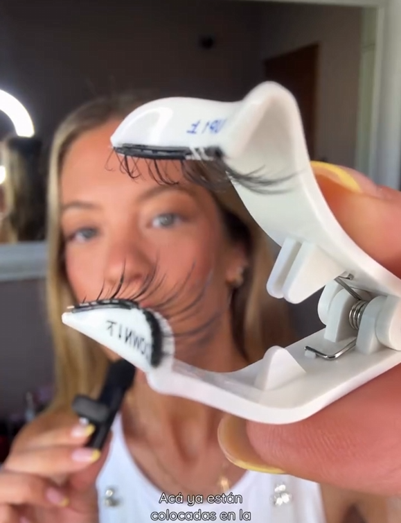 Apoyá la pinza sobre el párpado y presioná la pinza hasta sentir el click, luego retirá la pinza suavemente. Esto evita que las pestañas magnéticas se muevan de su lugar.